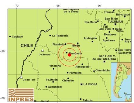 Epicentro: 17 km al SE de Tinogasta, 150 km al N de La Rioja, 169 km al O de San F. Del Valle De Catamarca. -28.155 (lat) -67.427 (long)