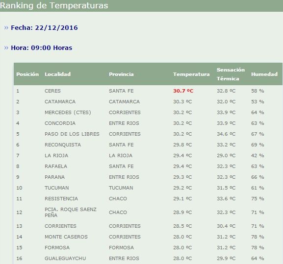 Según el ranking de temperaturas elaborado por el Servicio Meteorológico Nacional, a las 9 de la mañana, Catamarca tenia el segundo registro más alto del País, con 30.3°. El primero lugar lo ocupaba la ciudad de Ceres, en Santa Fe, con 30,7°.