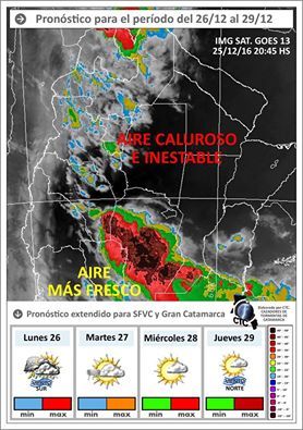 En estos momentos estamos bajo la influencia de aire muy caluroso e inestable. Dentro de esta masa de aire se están produciendo algunas tormentas de forma aislada en distintos puntos de la provincia, tormentas que pueden seguir apareciendo con el pasar de las horas, dispersas en el territorio provincial (incluso hasta pueden aparecer sobre el Valle Central como lo estuvieron haciendo en zonas de los departamentos Ambato y Paclín, desde hace unas horas; sólo que al ser tormentas aisladas, aunque alguna puede ser fuerte con buena actividad eléctrica, es difícil saber dónde exactamente se formarán). Estaremos atentos a su posible formación (el servicio meteorológico ha emitido una alerta para la región Este de la provincia por posibles tormentas fuertes para las próximas horas).
