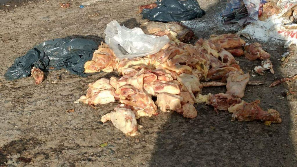 ver restos de pollo en estado de descomposición en la cinta asfáltica, a