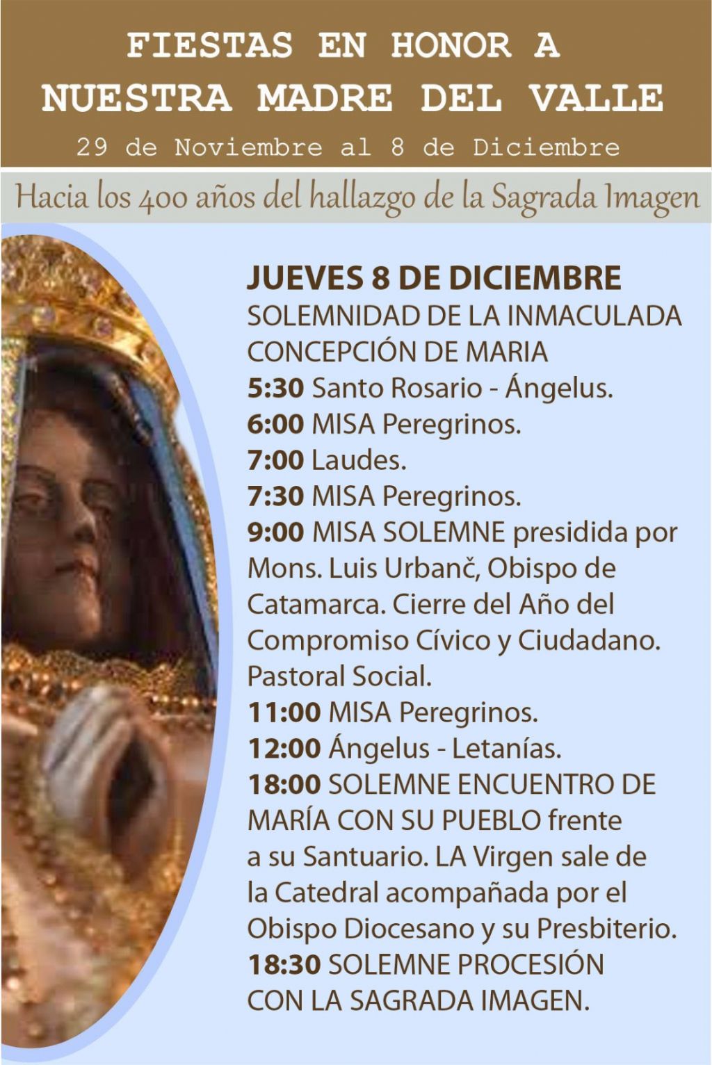 el rezo del Santo Rosario y Ángelus. A las 6.00, 7.30 y 11.00 habrá misas de