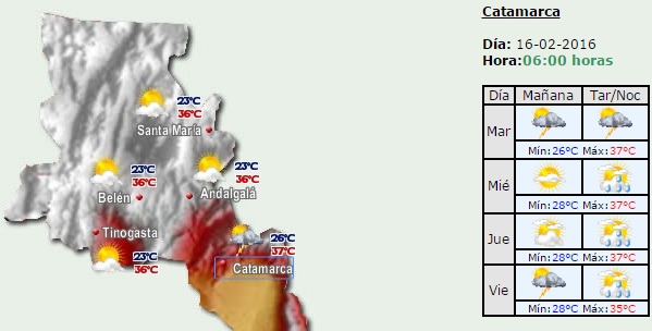 El Servicio Meteorológico Nacional prevé desde hoy y hasta el viernes lluvias y tormentas para el Valle Central catamarqueño. Según el pronóstico extendido, las temperaturas continuarán altas, y girarán en torno a los 37°.