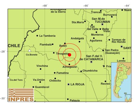 Epicentro: 109 km al O de San F. Del Valle De Catamarca, 140 km al N de La Rioja, 46 km al N de Aimogasta. -28.148 (lat) -66.799 (long)