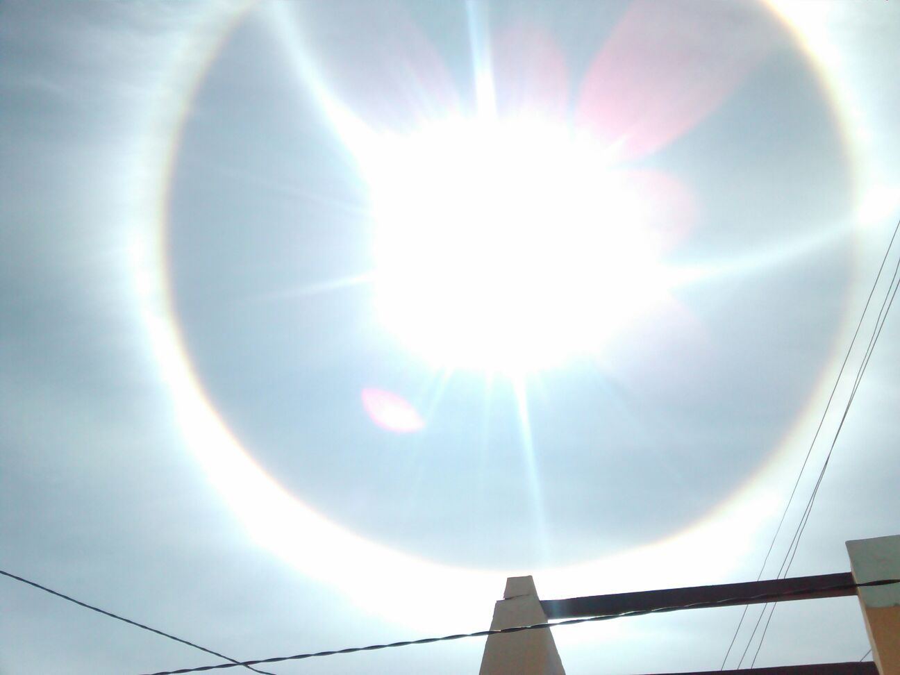 Según se explicó, se trata de un halo solar, que por lo general antecede a una tormenta. El fenómeno es generado por nubes que se encuentran a gran altura y refractan la luz del Sol.