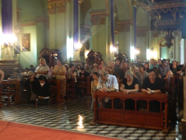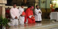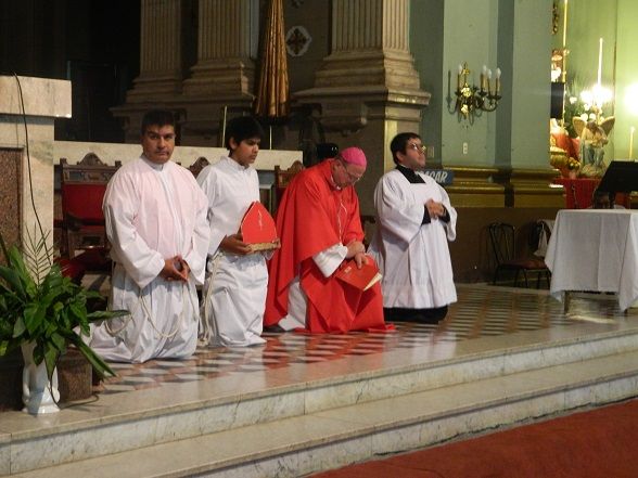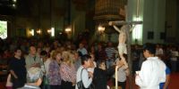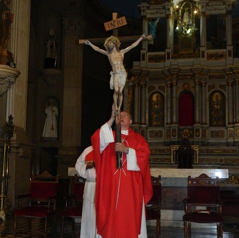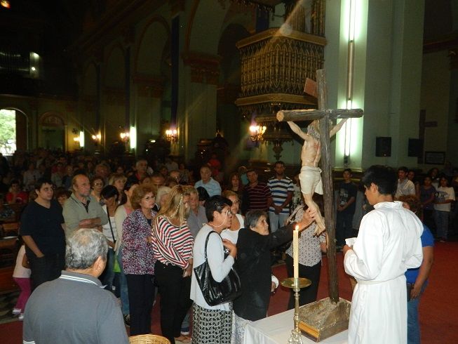 A continuación, se realizó el rito de la Adoración de la Santa Cruz, árbol que sostuvo la Salvación del mundo. En una procesión desde el ingreso al Santuario, el Obispo levantó en alto la imagen de Jesús Crucificado y con alabanzas la fue descubriendo hasta llegar al altar. La Santa Cruz fue colocada en un sitio de honor para que todos los presentes se acercaran a adorarla.