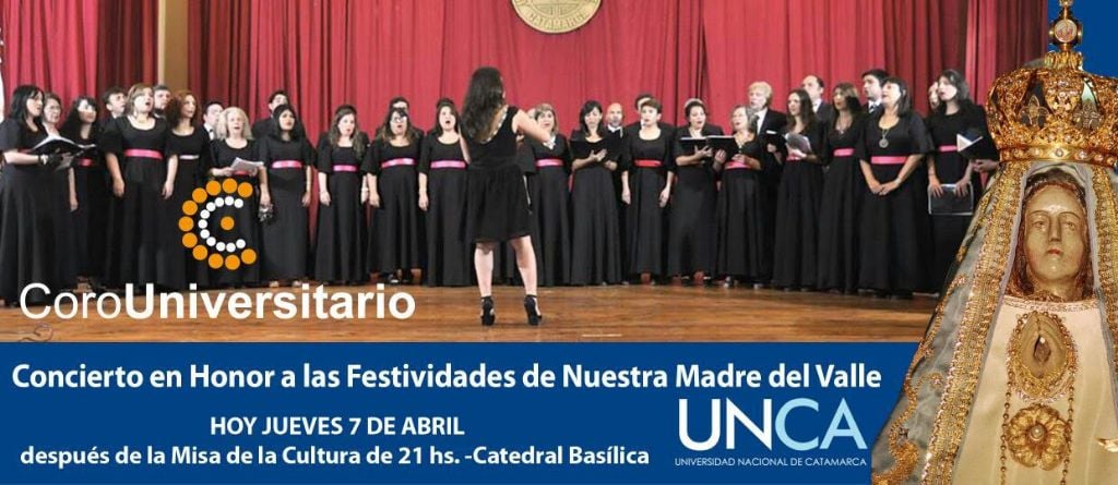 El Coro Universitario UNCA brindará un concierto en homenaje a la Virgen del Valle en adhesión a las fiestas Marianas, hoy jueves 7 de abril, al término de la misa de las 21 horas, en la Catedral Basílica.
