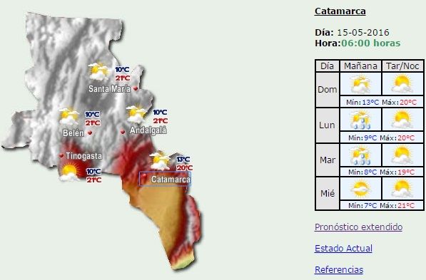 El pronóstico extendido del Servicio Meteorológico Nacional, prevé para los próximos días, temperaturas mínimas bastante bajas, que estarán en el orden de los 7°. Las máximas, en tanto, se ubicarán en torno los 21°. Para el lunes y martes se anuncian probabilidad de precipitaciones.