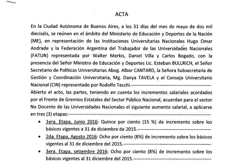Tal como se esperaba, la Federación Argentina de Trabajadores Universitarios (FATUN) firmó un acuerdo de incremento salarial del 31% a pagar en tres partes. Según se supo, un 15% se pagará en junio, un 8% en agosto y el 8% restante en septiembre.