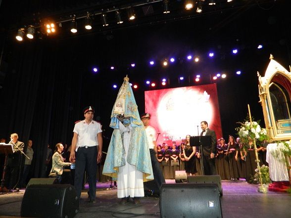 La bendita y portentosa imagen de Nuestra Señora del Valle fue recibida en un clima de fiesta, tras lo cual se entonaron las estrofas del Himno Nacional Argentino interpretadas por el tenor catamarqueño Nicolás Romero junto al coro del Teatro Colón.