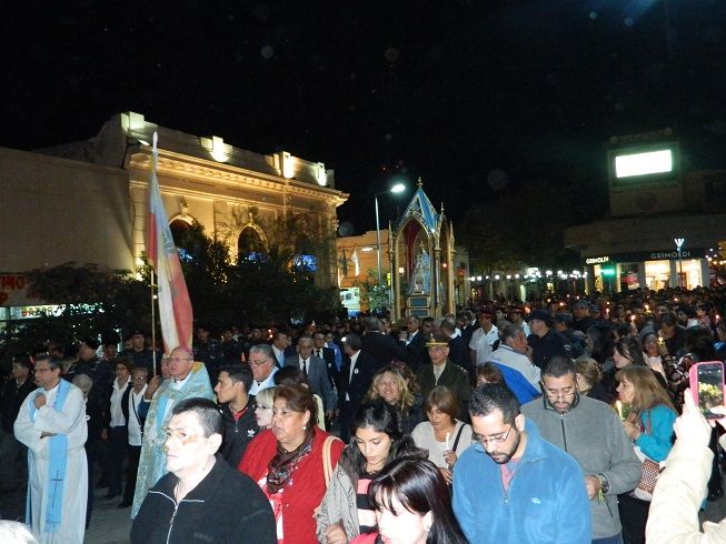 A continuación, la música del joven cantautor catamarqueño Franco Rodríguez animó la preparación de la procesión con antorchas. Muchos se ubicaron en el Paseo de la Fe, desde donde se inició la procesión, presidida por el Obispo Diocesano, Mons. Luis Urbanc, junto a sacerdotes del clero local, autoridades y miembros de las Fuerzas de Seguridad y fieles en general. La columna iluminada caminó junto a la Imagen casi cuatro veces centenaria de la Virgen del Valle alrededor de la plaza 25 de Mayo, cantando, alabando y recordando la historia de la Coronación Pontificia y meditando en las obras de misericordia.