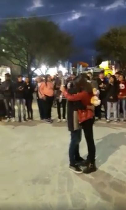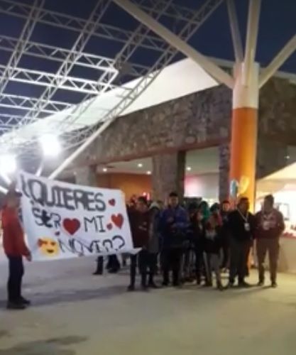 El jovencito entrega en manos de la jovencita las flores, le da un abrazo y algo le susurra en su oído; luego la traslada unos metros donde sus amigos tenían un cartel con corazones que decía: "¿Querés ser mi novia?”. Todo un romántico.