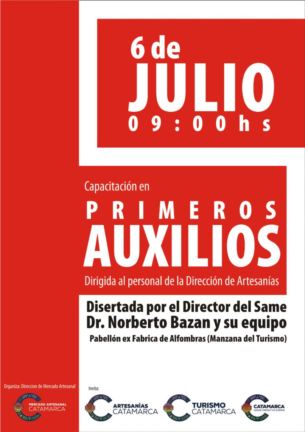 Este próximo miércoles 6 de julio, desde las 9 de la mañana, en el aula de la Fábrica de Alfombras, se realizará un taller sobre 1ros Auxilios dirigido al personal de la Dirección de Mercado Artesanal.