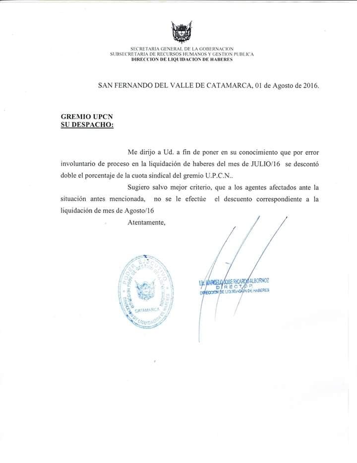 "Sugiero, salvo mejor criterio, que a los agentes afectados ante la situación antes mencionada, no se le efectúe el descuento correspondiente a la liquidación del mes de agosto de 2016", señala un comunicado de la dirección de Liquidación de Haberes.
