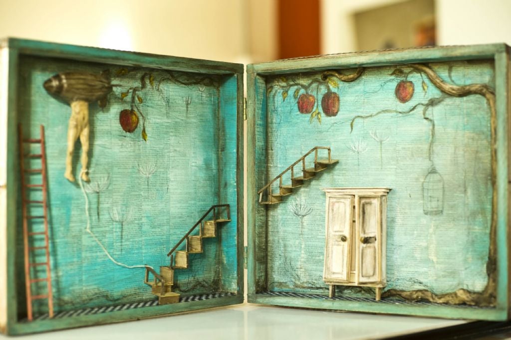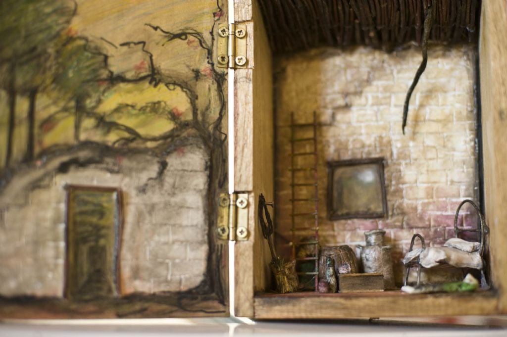 interior, encierran micro-objetos realizados con pasta das, alambre, madera
