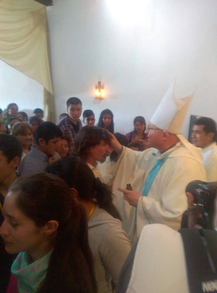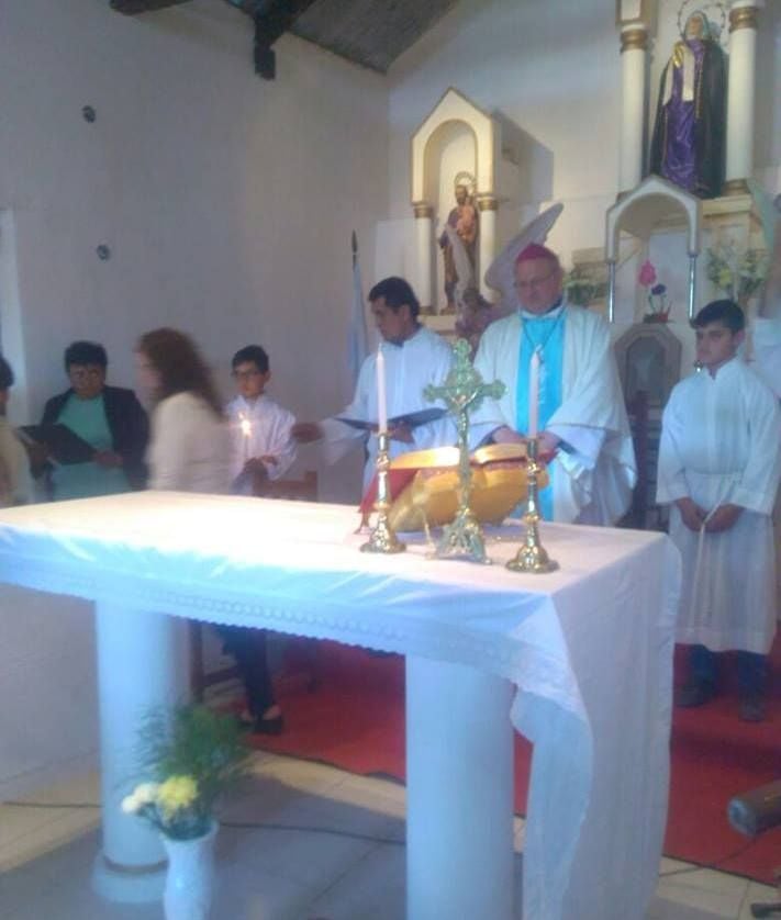 El Pastor Diocesano llegó pasadas las 10.30, y la comunidad salió a su encuentro junto con su párroco, Pbro. Eugenio Pachado, y el Intendente de El Alto, Prof. Ariel Ojeda.
