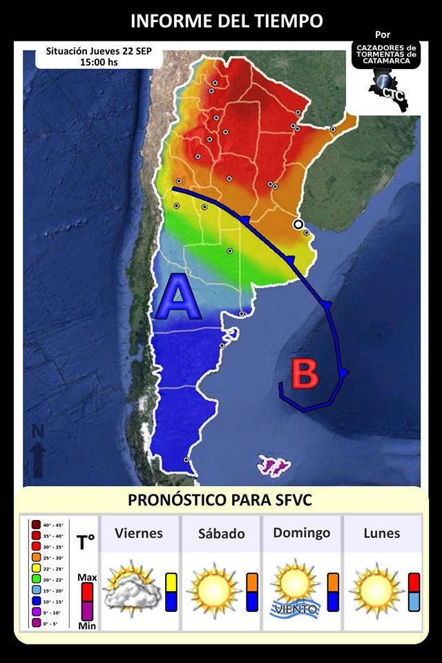 "Luego de un lunes ventoso, un martes con mucho polvo en suspensión producto de un viento norte que dio que hablar, un miércoles con una reducción en la velocidad del mismo y un jueves con ascenso en las temperaturas acompañado de la calma de los vientos de componente norte, nuestro Valle Central está listo para tener acción nuevamente, como así también el resto de nuestro territorio provincial.