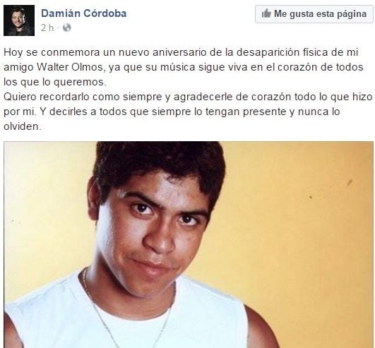 "Hoy se conmemora un nuevo aniversario de la desaparición física de mi amigo Walter Olmos, ya que su música sigue viva en el corazón de todos los que lo queremos. Quiero recordarlo como siempre y agradecerle de corazón todo lo que hizo por mi. Y decirles a todos que siempre lo tengan presente y nunca lo olviden", escribió el cantante en Facebook.