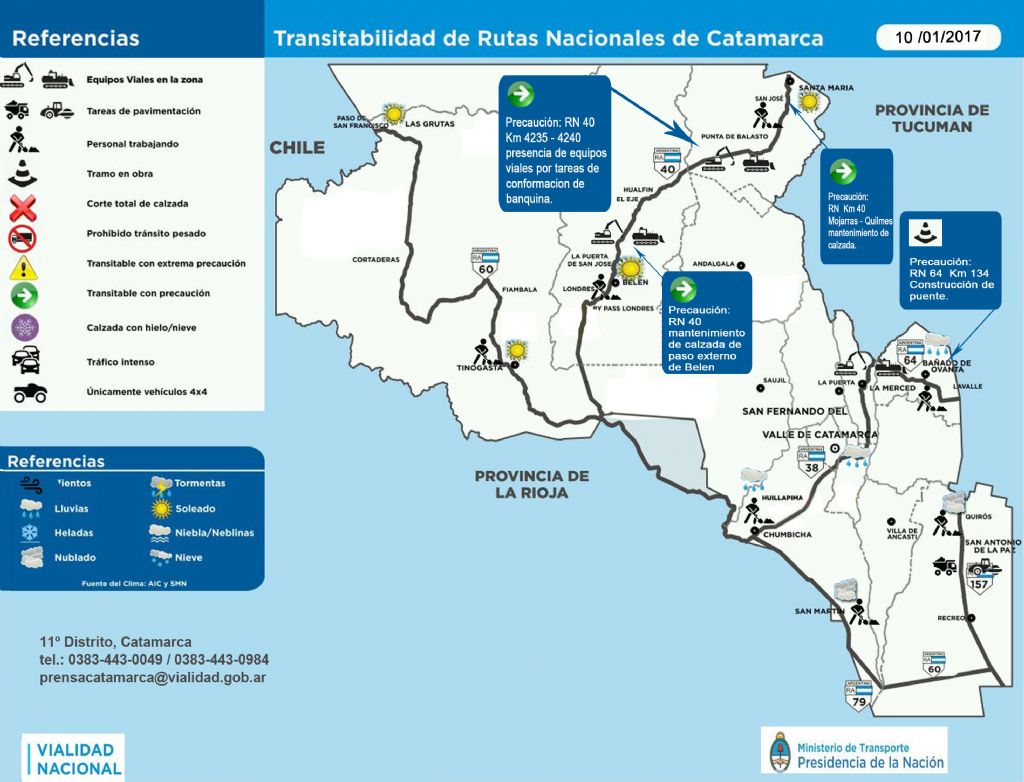 El Ministerio de Transporte de la Nación, a través de la Dirección Nacional de Vialidad (D. N. V.), informa sobre el estado de transitabilidad de las rutas nacionales bajo la jurisdicción del 11º Distrito Catamarca.
