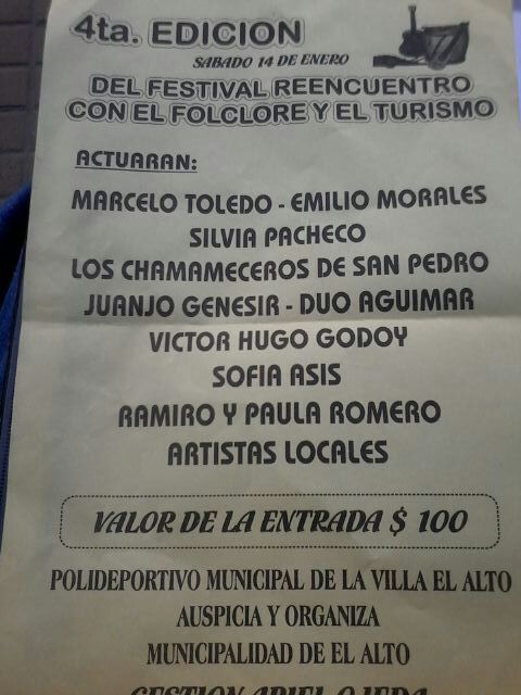 El Alto, a partir de las 22 horas, donde actuarán: Marcelo Toledo, Emilio