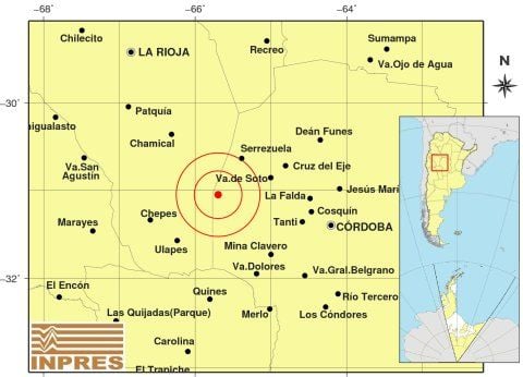 Epicentro: 148 km al O de Córdoba, 213 km al SE de La Rioja, 56 km al SO de Serrezuela. 56 km al SO de Serrezuela. 148 km al O de Córdoba. -31.050 (lat) -65.697 (long)