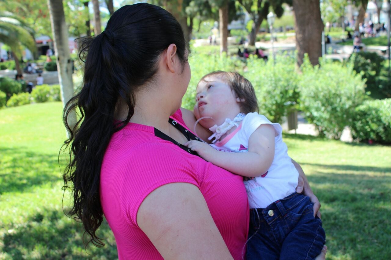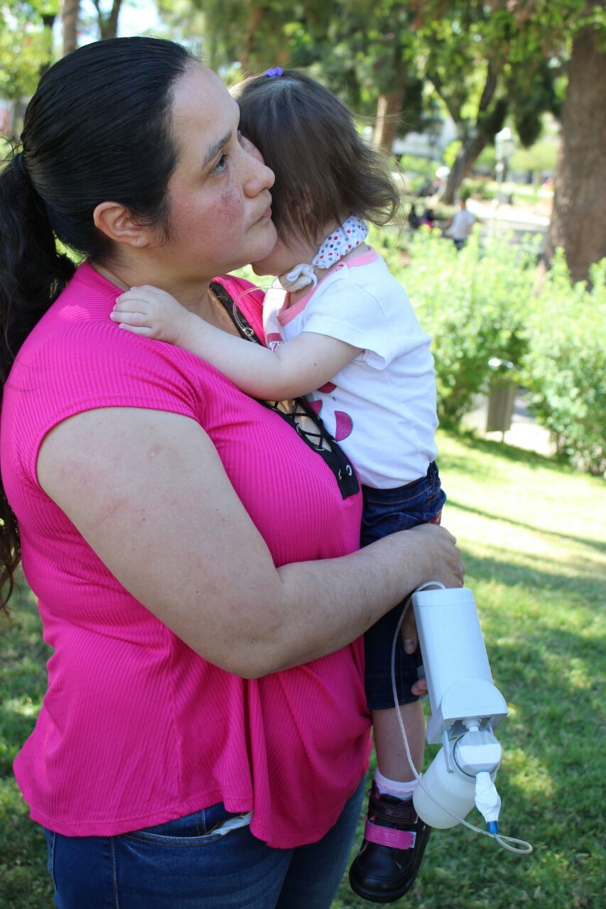con la pequeña electrodependiente en brazos.
