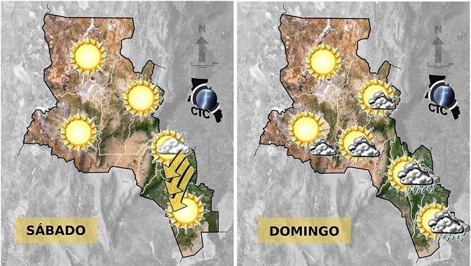 La persistencia del viento noreste durante el sábado con el aporte de humedad, hará que el domingo aparezca mayor nubosidad para esta región, especialmente en su porción norte (departamentos Santa Rosa y El Alto). Incluso, se podrían dar precipitaciones en forma de llovizna en la ladera oriental de la sierra Ancasti (ej. Guayamba) durante la madrugada del domingo. Sin embargo, el mayor cambio de tiempo se sentirá en horas de la noche, cuando se haga presente un sistema inestable que deje mayores precipitaciones en gran parte de esta región. Las temperaturas mínimas rondarán los 17° y las máximas los 29° en las zonas llanas del norte de la región. Al sur de la misma (departamento La Paz) las máximas pueden trepar hasta los 31°.