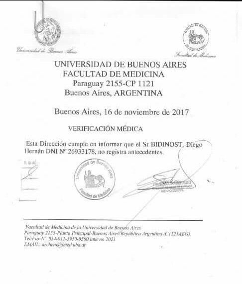 "Nosotros emitimos la Matrícula pero el trámite fue realizado personalmente por Diego Hernán Bidinost, el cual presentó título y certificado de la UBA, también presentó declaración jurada, fijó domicilio legal en la provincia, la documentación fue certificada por Escribano Público.