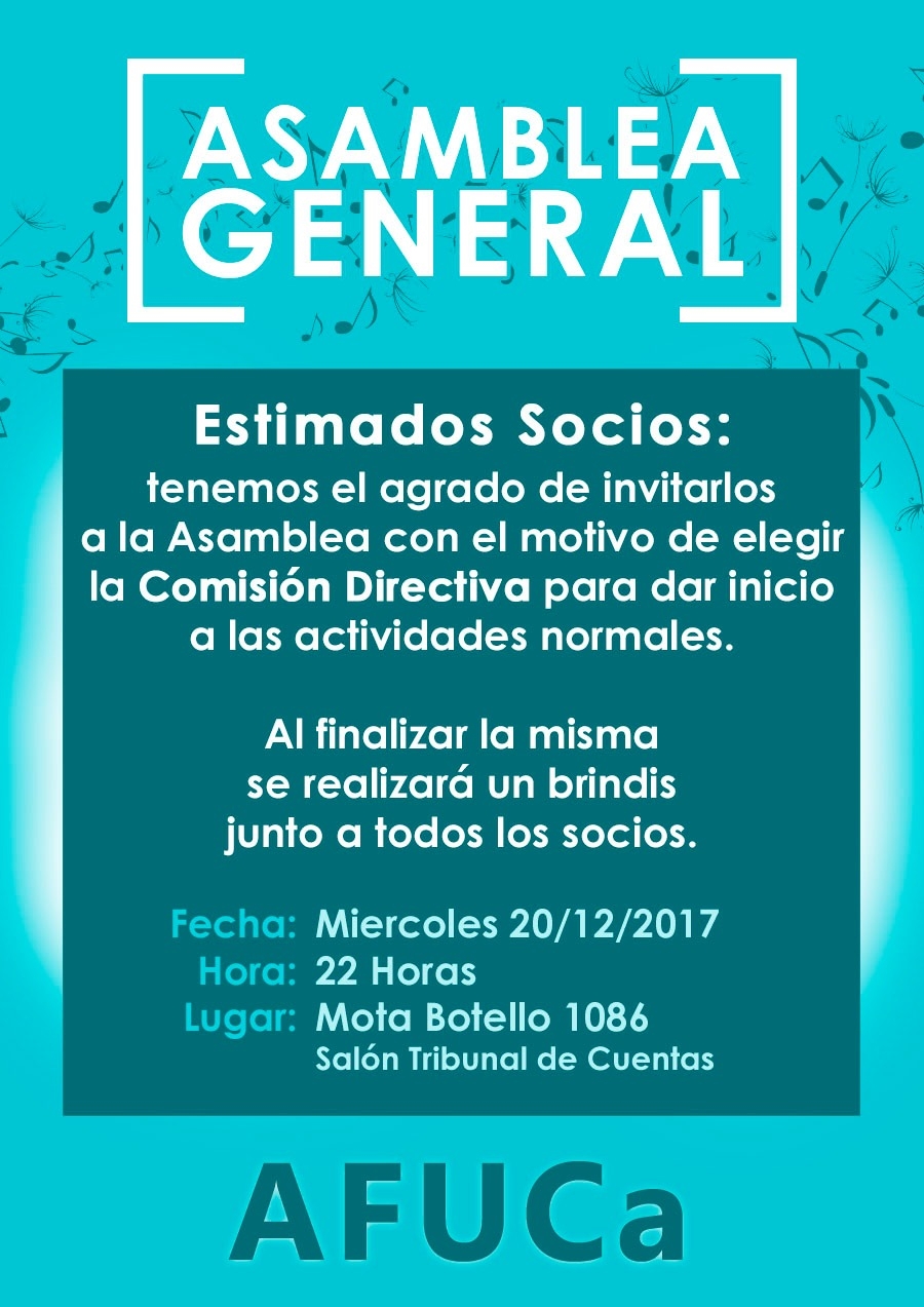 Recurriendo al viejo padrón de socios y sumando nuevos afiliados, la AFUCA volvió a tomar forma cumpliendo trabajosa y puntillosamente con los requisitos exigidos por la IGPJ hasta llegar a la convocatoria a la Asamblea General, que este miércoles, 20 de diciembre, a las 22 hs., en el Salón del Personal del Tribunal de Cuentas, sito en Mota Botello 1086, de esta ciudad, deberá proceder a la elección de la nueva Comisión Directiva.