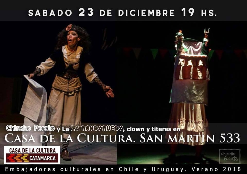 La propuesta, para disfrutar en familia, está programada para este sábado 23 de diciembre a las 19 hs. Chincho Poroto (Federico Abaca) y La Rondarueda (Roxana Castro) ofrecen este show –a la gorra- como última presentación del año y como la última actividad del 2017 en la Casa de la Cultura.