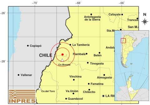 Epicentro: 262 Km. al NO de La Rioja, 304 Km. al O de San F. Del Valle De Catamarca, 57 Km. al SO de La Tambería. -27.724 (lat) -68.724 (long)