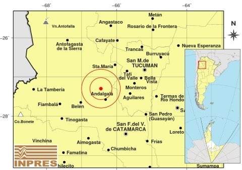 Epicentro: 135 Km. al SO de San Miguel De Tucumán, 145 Km. al NO de San F. Del Valle De Catamarca, 34 Km. al NO de Andalgalá. -27.302 (lat) -66.450 (long)