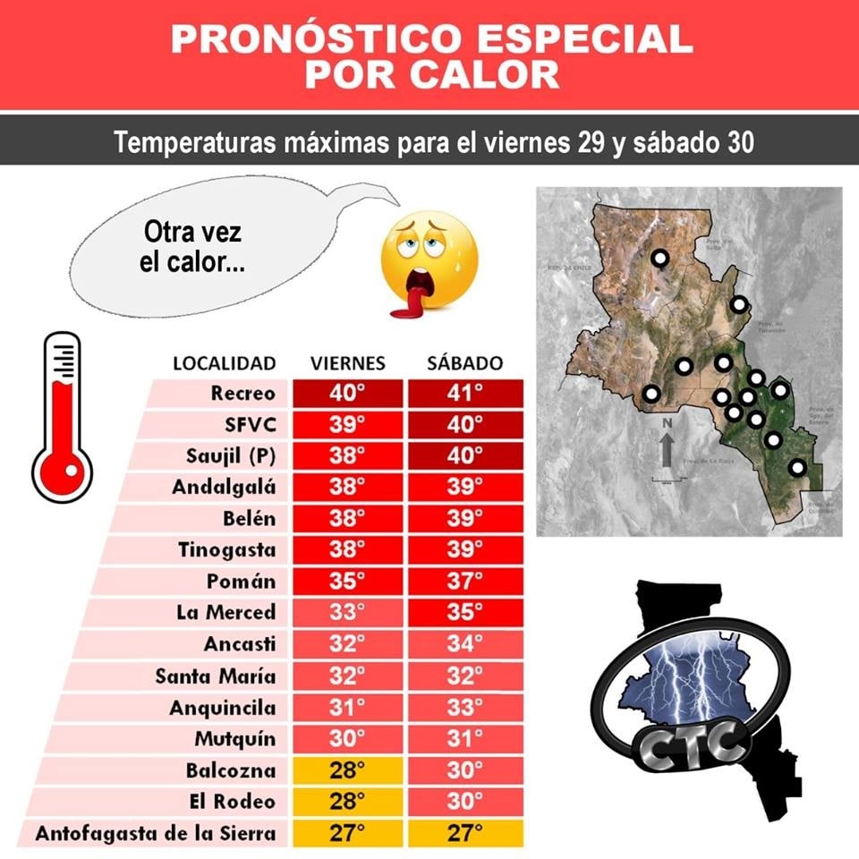 Las temperaturas máximas llegarán a los 41°C en el caso de Recreo, que será la ciudad más caliente de Catamarca en estos dos días, mientras que en la Capital la máxima será de 40°C.