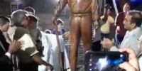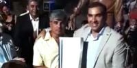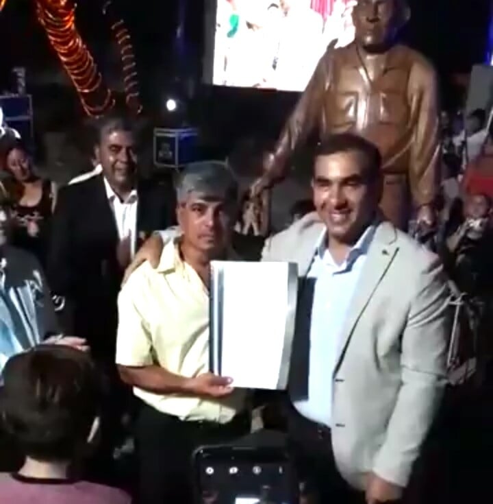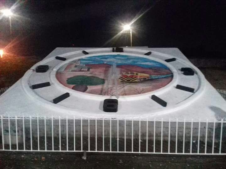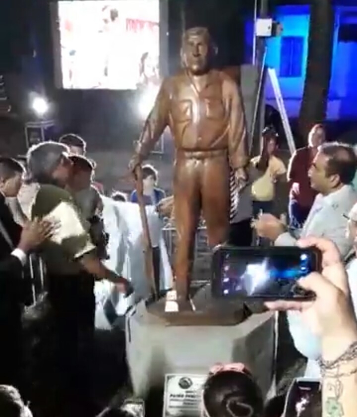Herrera junto uno de los hijos del extinto intendente Lazarte descubrieron una plaqueta e inauguraron la "estatua" tallada en la madera de Faustino Lazarte, al cual su hijo le colocó una de sus gorras.