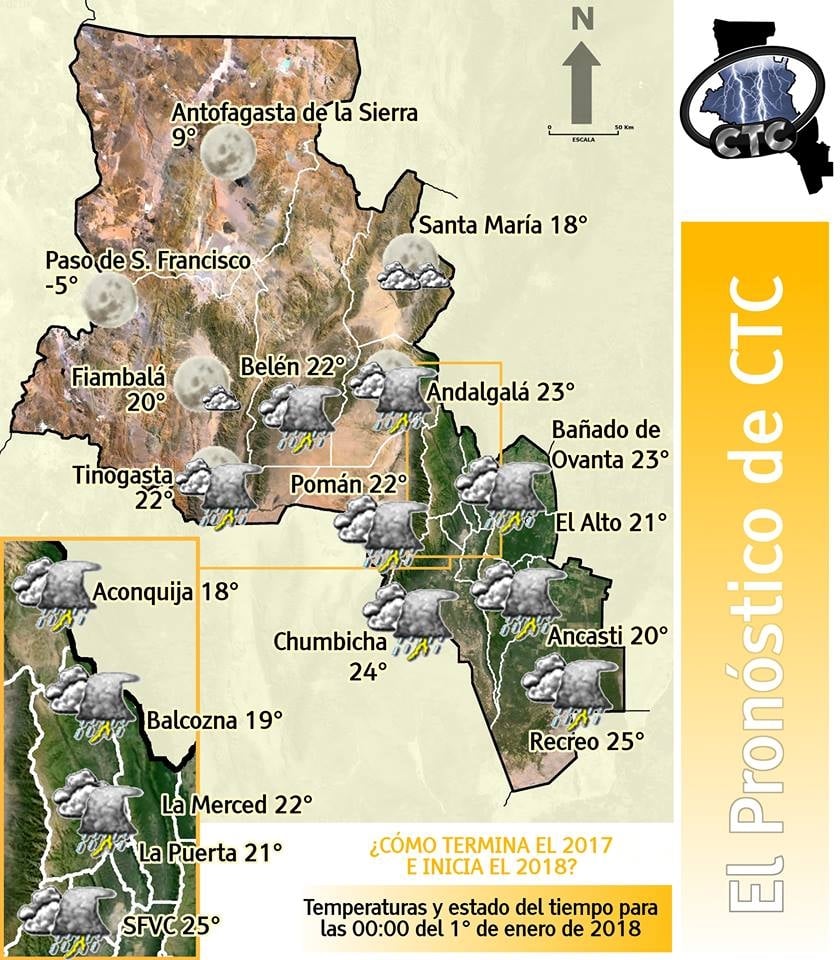 Lugares como Fiambalá o Santa María posiblemente tengan sólo cielo parcialmente nublado a las 00:00 horas del 01-01-18. El resto de las localidades, si no tienen precipitaciones justo a las 00:00, las tendrán antes o después.