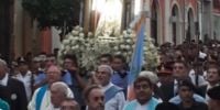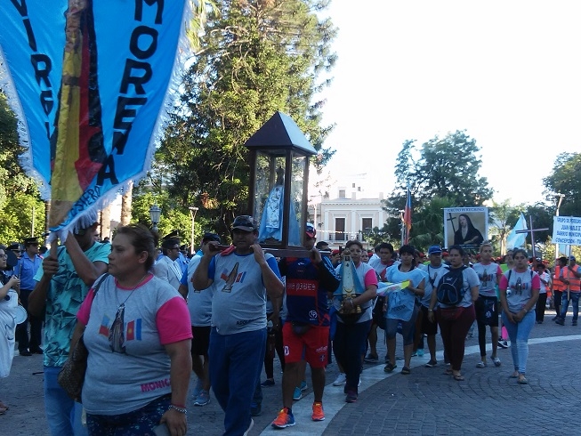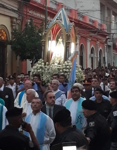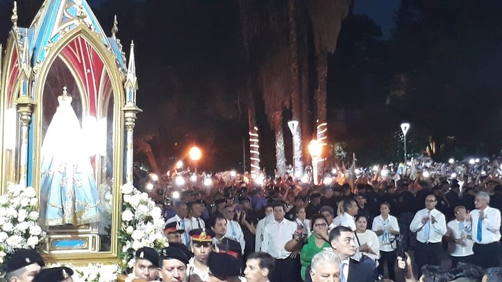 Luego del paso de la columna de peregrinos, las campanadas y los acordes de la Banda de Música anunciaron el inicio de la Solemne Procesión, cuando el Señor Obispo colocó la Sagrada Imagen en la urna preparada para la marcha procesional. Delante se ubicaron las religiosas y religiosos, seminaristas, sacerdotes y el Señor Obispo, y detrás las autoridades provinciales y municipales, encabezadas por la Señora Gobernadora, Dra. Lucía Corpacci, y el Intendente de Capital, Lic. Raúl Jalil, respectivamente, autoridades legislativas, judiciales y de las Fuerzas de Seguridad, peregrinos y fieles en general.