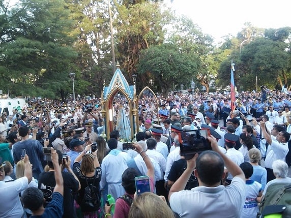 En la plaza 25 de Mayo la esperaban las autoridades provinciales y municipales, legislativas, judiciales y de las Fuerzas de Seguridad, junto con una gran cantidad de fieles, que hizo sentir su fervor y emoción cuando la Virgen bendita apareció en el Paseo de la Fe, mientras escuchaban los acordes de la Banda de Música de la Policía de la Provincia y la animación del grupo Yanai.