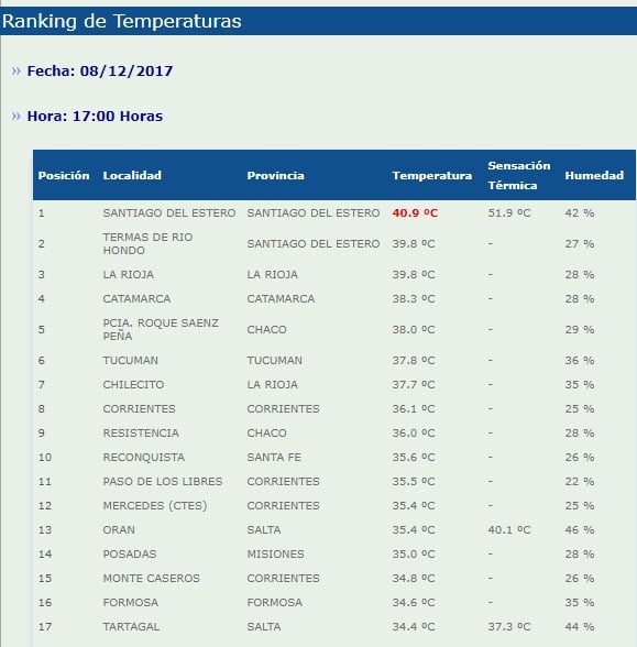 El ranking lo lideraba Santiago del Estero con 40.9°C, y en segundo lugar Termas de Río de Hondo, con 39.8°C.
