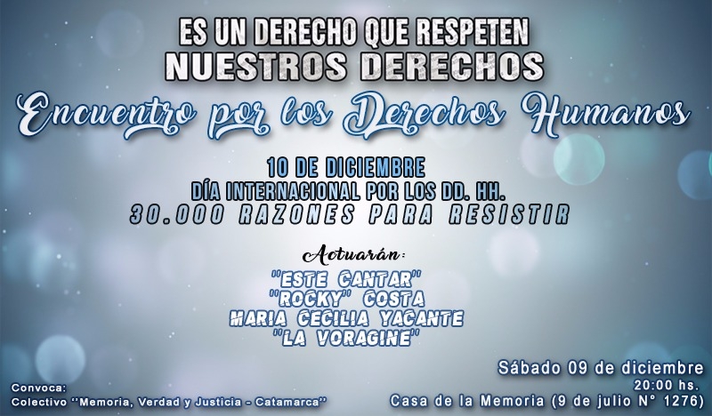 “Es un derecho que respeten NUESTROS DERECHOS…” es la consigna de la invitación al evento de esta noche por parte del colectivo catamarqueño en defensa de los derechos humanos.