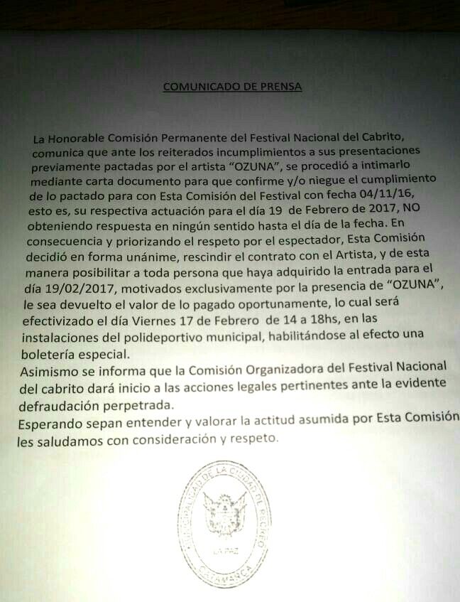 Permanente del Festival Nacional del Cabrito", informan que el cantante