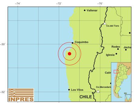 Epicentro: 310 km al NO de San Juan, 371 km al NO de Mendoza, 53 km al S de Coquimbo. -30.407 (lat) -71.486 (long)