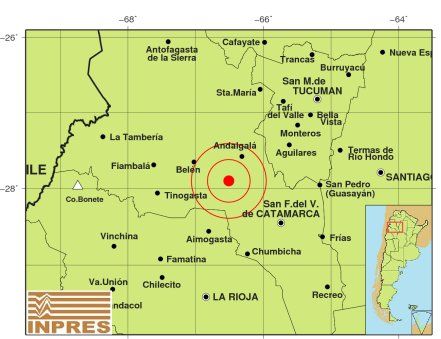 Epicentro: 97 km al NO de San F. Del Valle De Catamarca, 170 km al N de La Rioja, 41 km al SO de Andalgalá. -27.901 (lat) -66.510 (long)