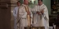 bendijo el agua, con la cual roció a la asamblea en recuerdo del Bautismo.