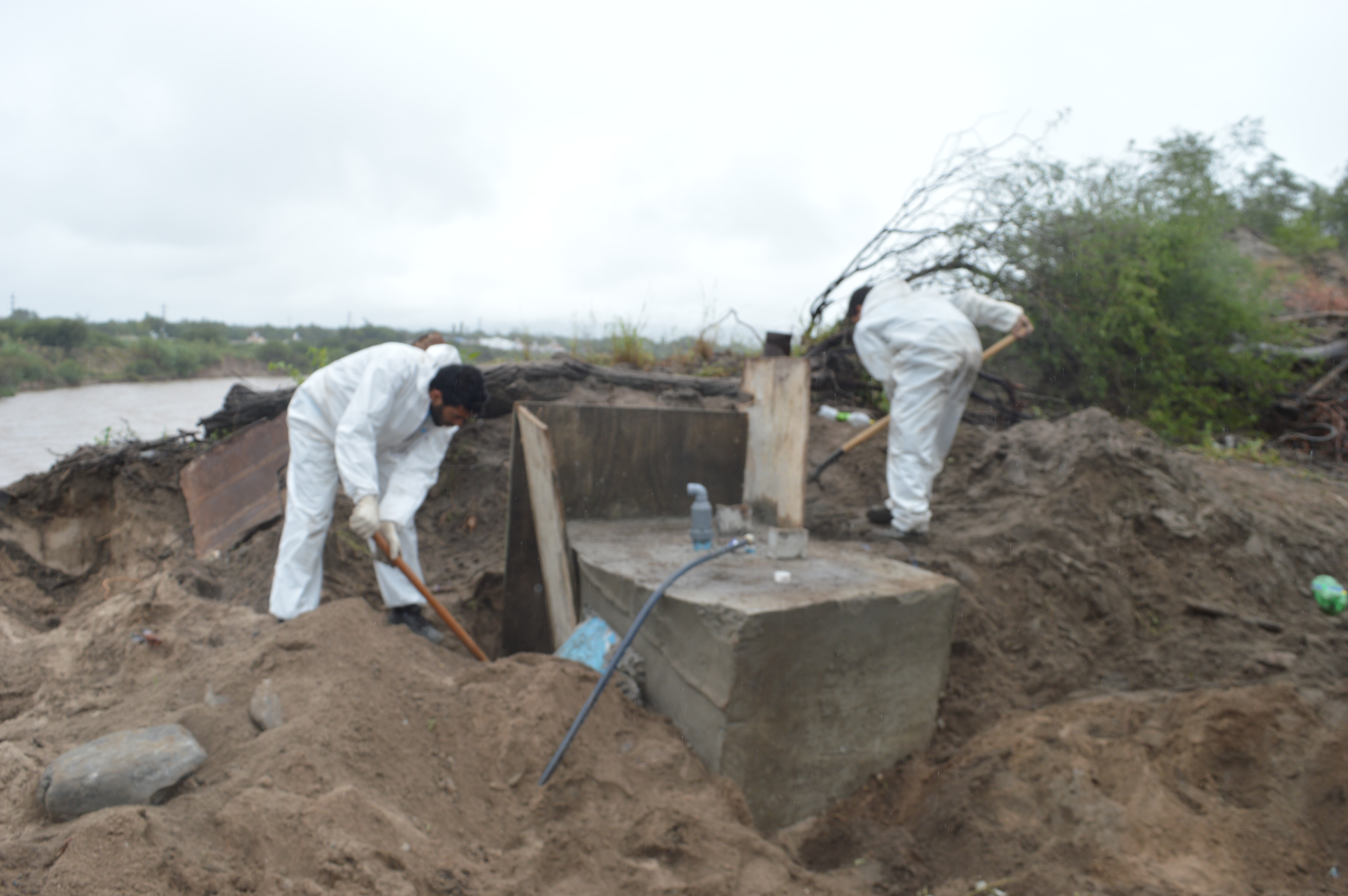 pozos 51 y 53, dónde se está realizando un espigón para desviar el río y poder