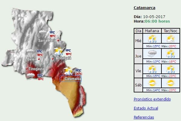 Situación: SOBRE EL AREA DE COBERTURA CONTINUARAN SOPLANDO VIENTOS DEL NOROESTE CON VELOCIDADES ENTRE 80 Y 100 KM/H, CON RAFAGAS, ESPECIALMENTE EN ALTA CORDILLERA. SE PREVE LA OCURRENCIA DE VIENTO BLANCO A PARTIR DE LA MADRUGADA DEL JUEVES 11 EN LAS ZONAS CORDILLERANAS ENTRE EL NORTE DE NEUQUEN Y SALTA. NO SE DESCARTA LA OCURRENCIA DE VIENTO ZONDA DE FORMA INTERMITENTE EN LA ZONA PRECORDILLERANA DE LA RIOJA Y CATAMARCA Y OESTE DE JUJUY Y OESTE DE SALTA DURANTE EL DIA JUEVES Y VIERNES. LOS VIENTOS INTENSOS SE MANTENDRAN AL MENOS HASTA EL DIA VIERNES 12, DISMINUYENDO LUEGO PROGRESIVAMENTE DE SUR A NORTE, Y ROTANDO AL SUDOESTE.