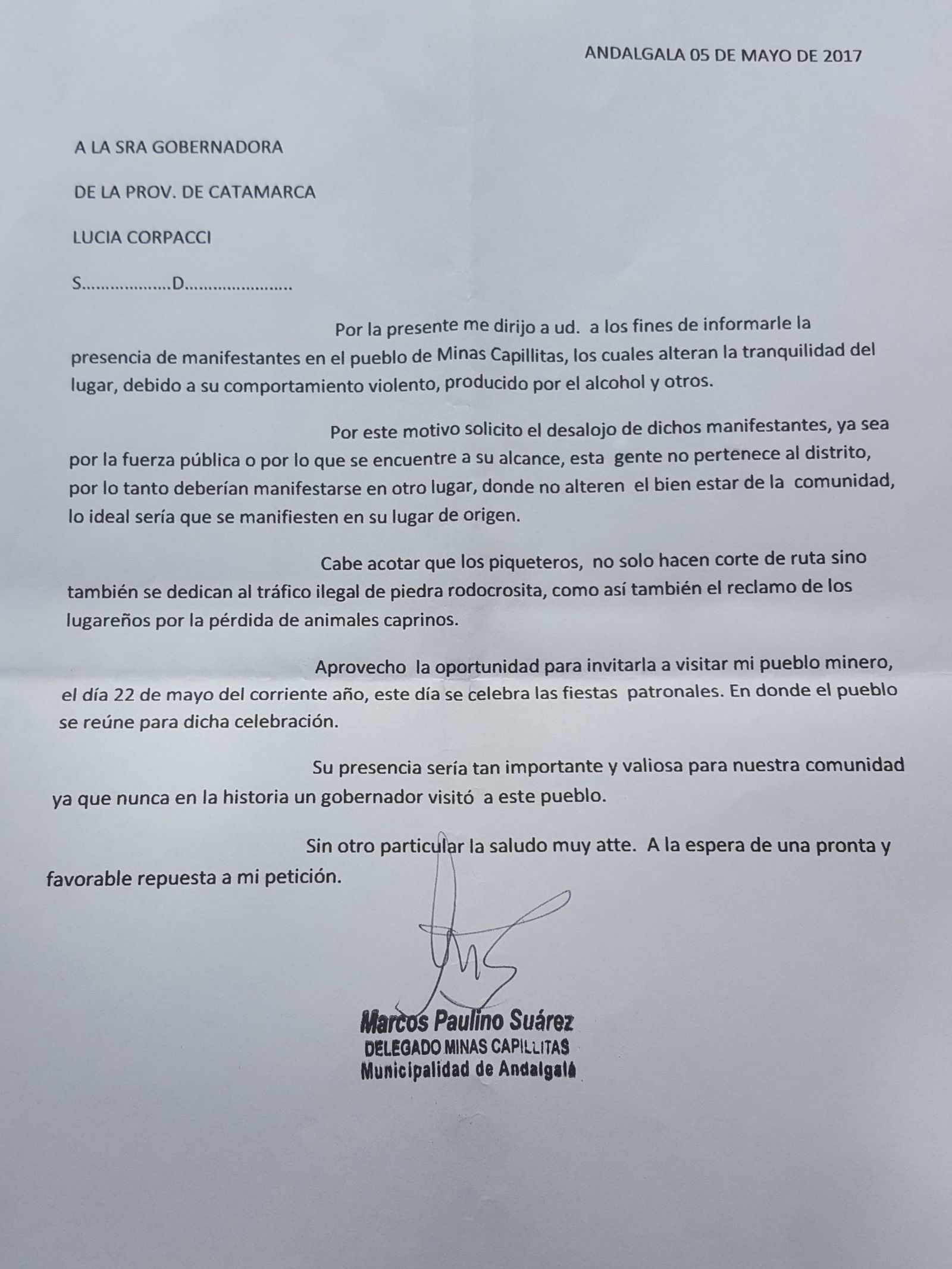Minas Capillitas, respaldó las declaraciones del delegado municipal, "porque