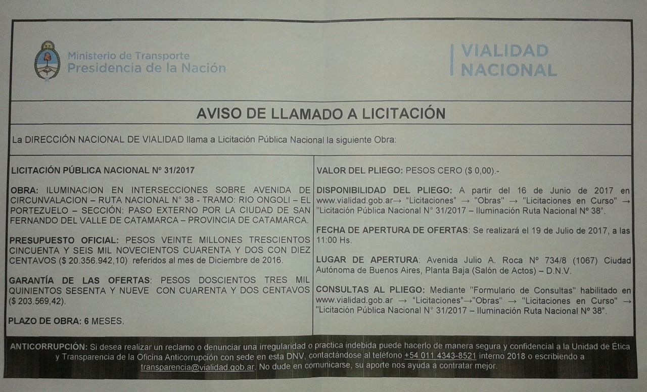 publicado el aviso de llamado a la Licitación Pública Nacional Nº 31/2017, de