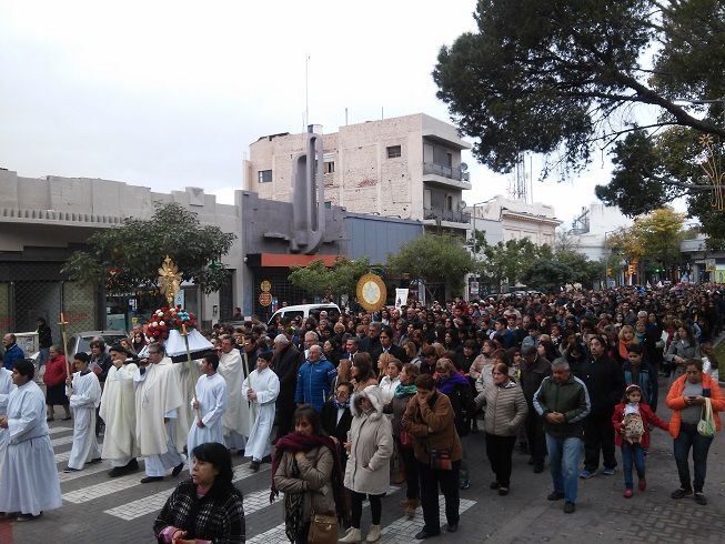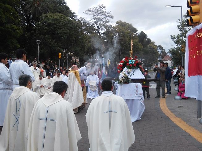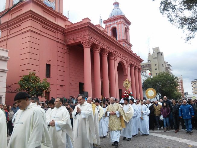 Al finalizar la celebración eucarística, los fieles participaron de la procesión más importante del año, acompañando al propio Cuerpo de Cristo, presente en la Sagrada Eucaristía, alrededor de la plaza 25 de Mayo. Tras la Cruz procesional se encolumnaron los abanderados y escoltas del Colegio Virgen Niña, el Señor Obispo y los sacerdotes, quienes portaron la Custodia con el Santísimo Sacramento.