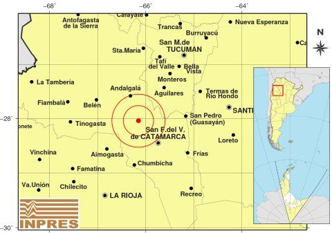 Epicentro: 61 km al NO de San F. Del Valle De Catamarca, 165 km al SO de San Miguel De Tucumán, 53 km al S de Andalgalá. -28.040 (lat) -66.150 (long)