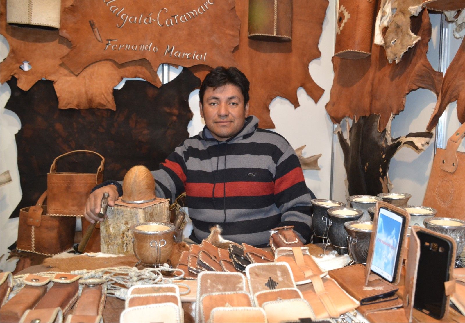 "Hago desde llaveros hasta maletines muy elaborados, bolsos materos, lo que la gente pida, trabajar con cuero es un trabajo que lleva su tiempo y tiene sus sacrificios pero me gusta hacerlo, me gusta mucho la posibilidad de exponer en el Poncho es el quinto año que vengo, y voy a venir siempre que pueda, esta es una oportunidad importante para mostrar mi trabajo. Y este año como siempre vengo a ser partícipe de esta fiesta y con las mejores expectativas de que a la gente le guste lo que hago, se lleve un producto lindo y de calidad".