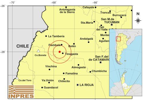 Epicentro: 178 km al NO de La Rioja, 200 km al O de San F. Del Valle De Catamarca, 17 km al NO de Tinogasta. -27.998 (lat) -67.715 (long)